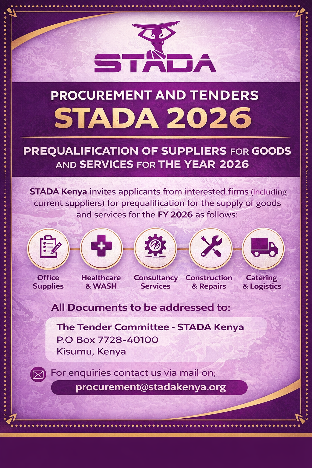 Tender documents for advertised opportunities can be obtained from the STADA Kenya Office during official working hours upon payment of the applicable non-refundable tender fee, where indicated.